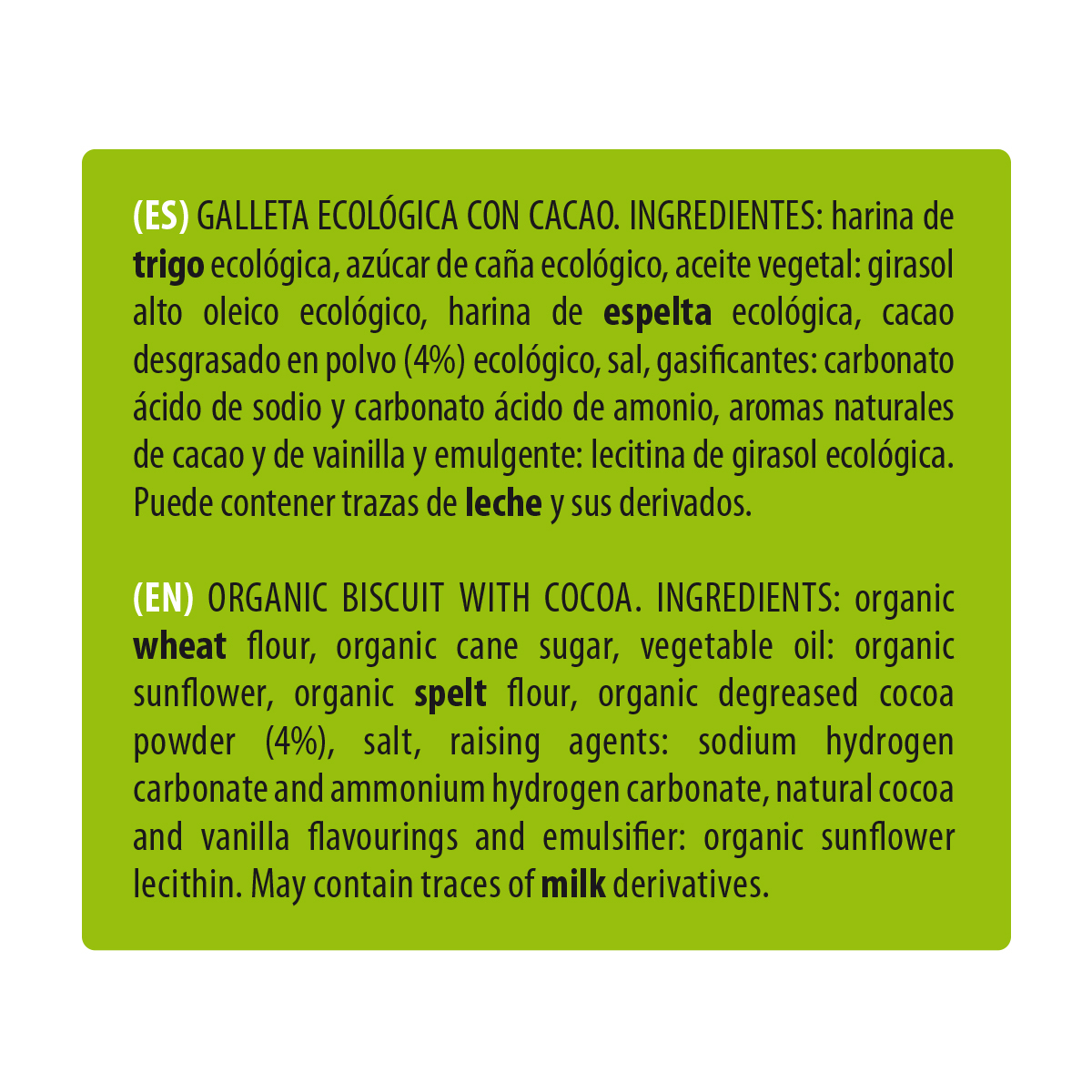 Făină de grâu ecologică, zahăr de trestie ecologic, ulei de floarea-soarelui high oleic ecologic, făină de spelta ecologică, cacao degresată (4%), agenți de afânare (bicarbonat de sodiu, bicarbonat de amoniu), lecitină de floarea-soarelui ecologică, arome naturale (cacao, vanilie).